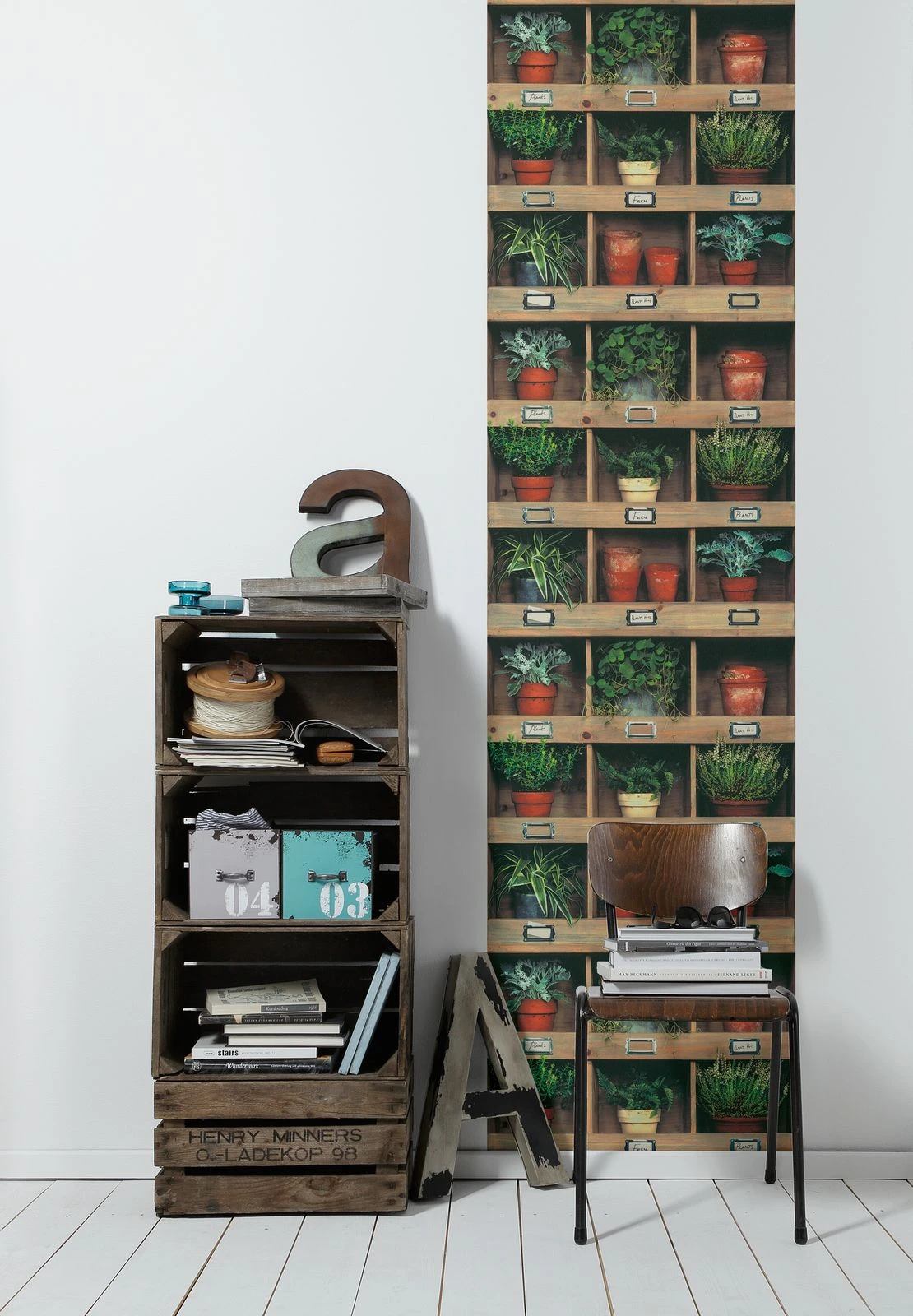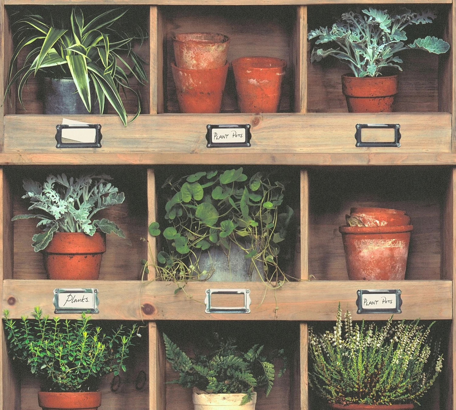 Tapete Selbstklebend Panel Regal Pflanzen braun grün rot Pop Up Panel 3D Livingwalls 368341